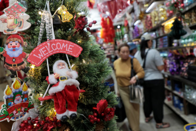 Selasa, 23 Desember 2025 - Sejumlah calon pembeli melihat pernak-pernik Natal yang dijual di salah satu toko di Pasar Asemka,