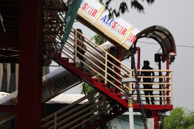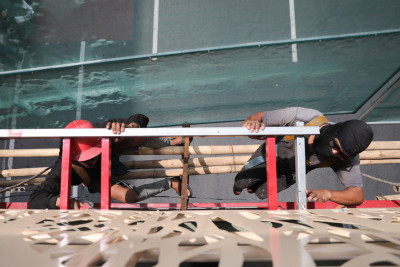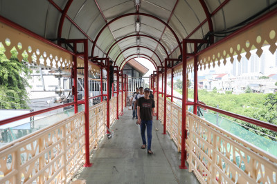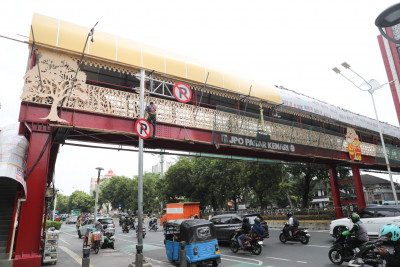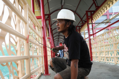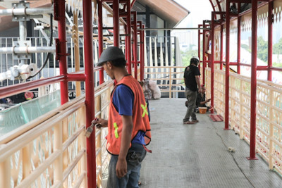 Senin, 13 Oktober 2025 - Sejumlah pekerja mengerjakan pemeliharaan jembatan penyeberangan orang (JPO) Pasar Kenari di Jalan