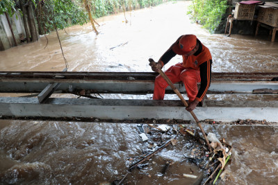 Senin, 12 Januari 2026 - Petugas gabungan bergerak cepat membersihkan sampah pascabanjir di Jati Padang, Pasar Minggu.