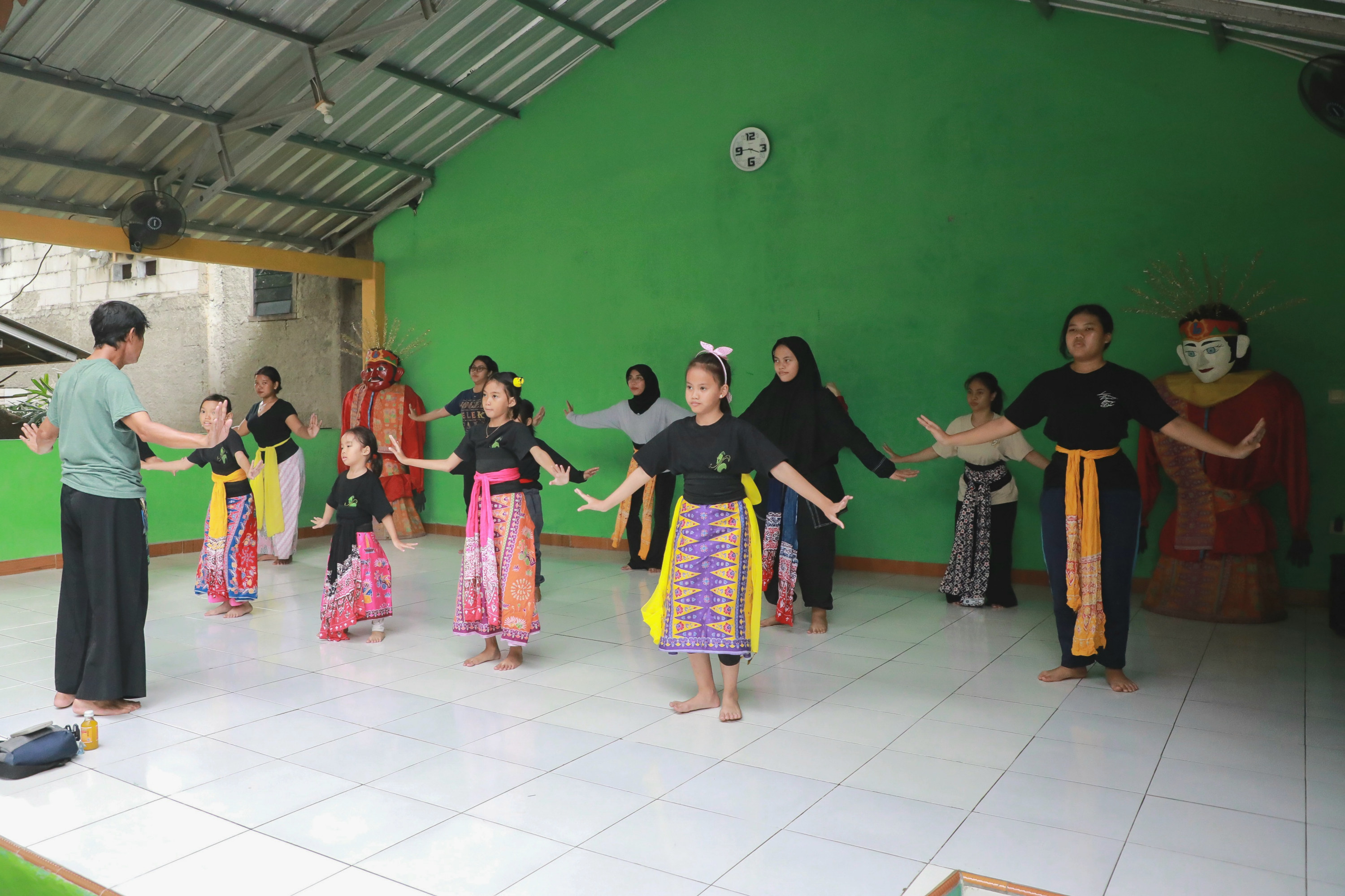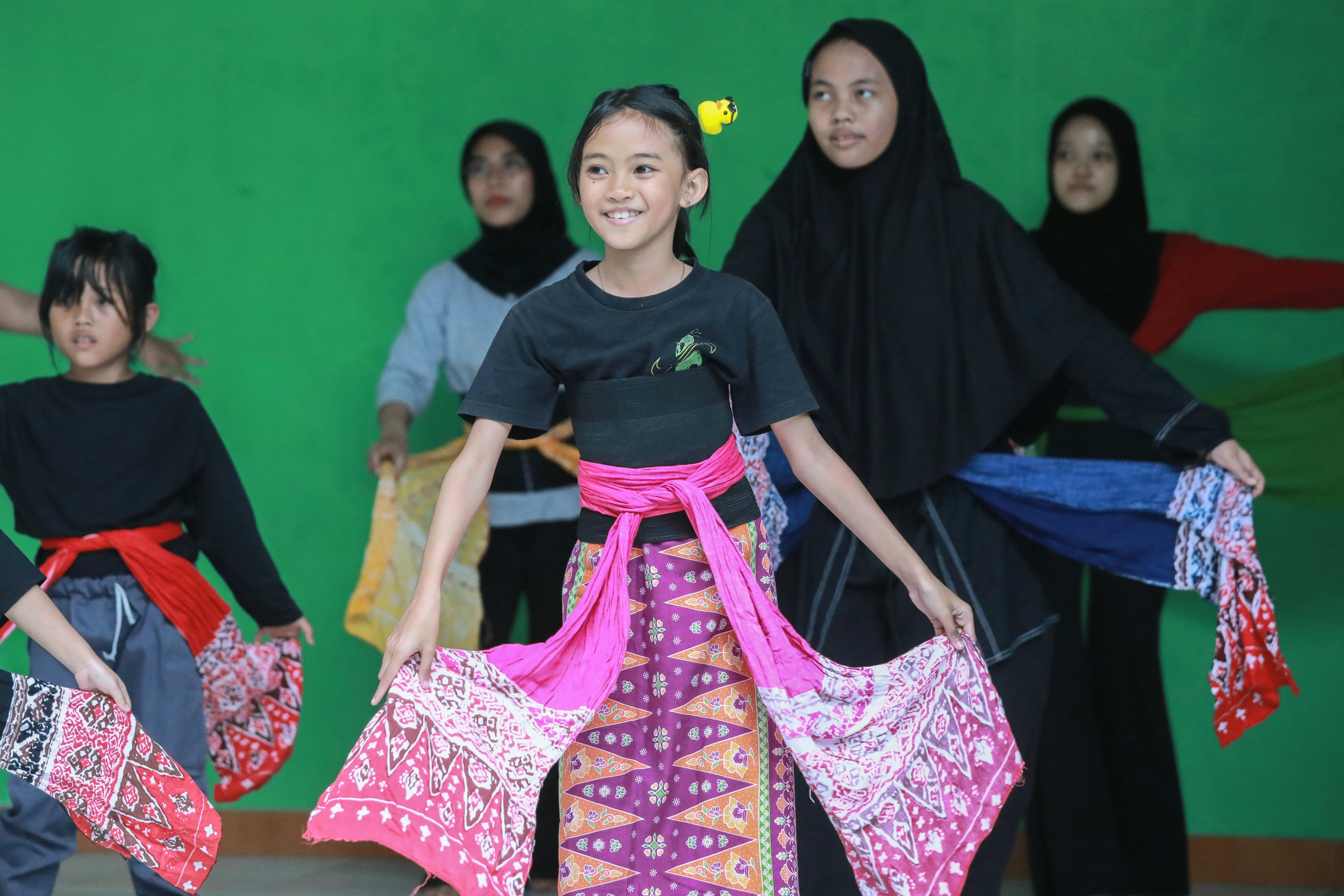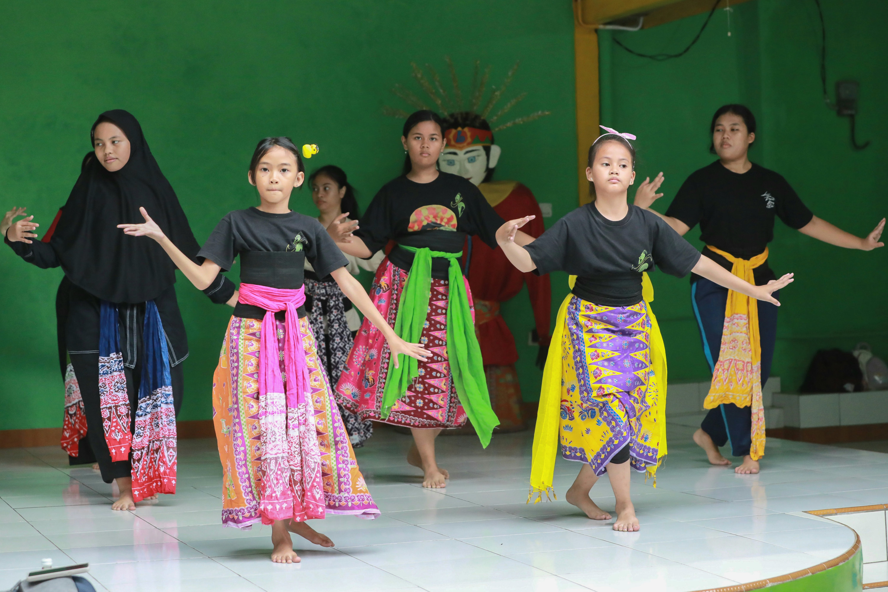 Di bawah teduhnya pepohonan, sekelompok penari muda tengah berlenggak-lenggok dengan penuh semangat dan ceria. Selendang aneka warna meliuk indah mengikuti setiap gerak lincah dan gemulai mereka, menciptakan harmoni yang memukau seiring alunan musik tradisional yang diputar dari sanggar dengan warna hijau.