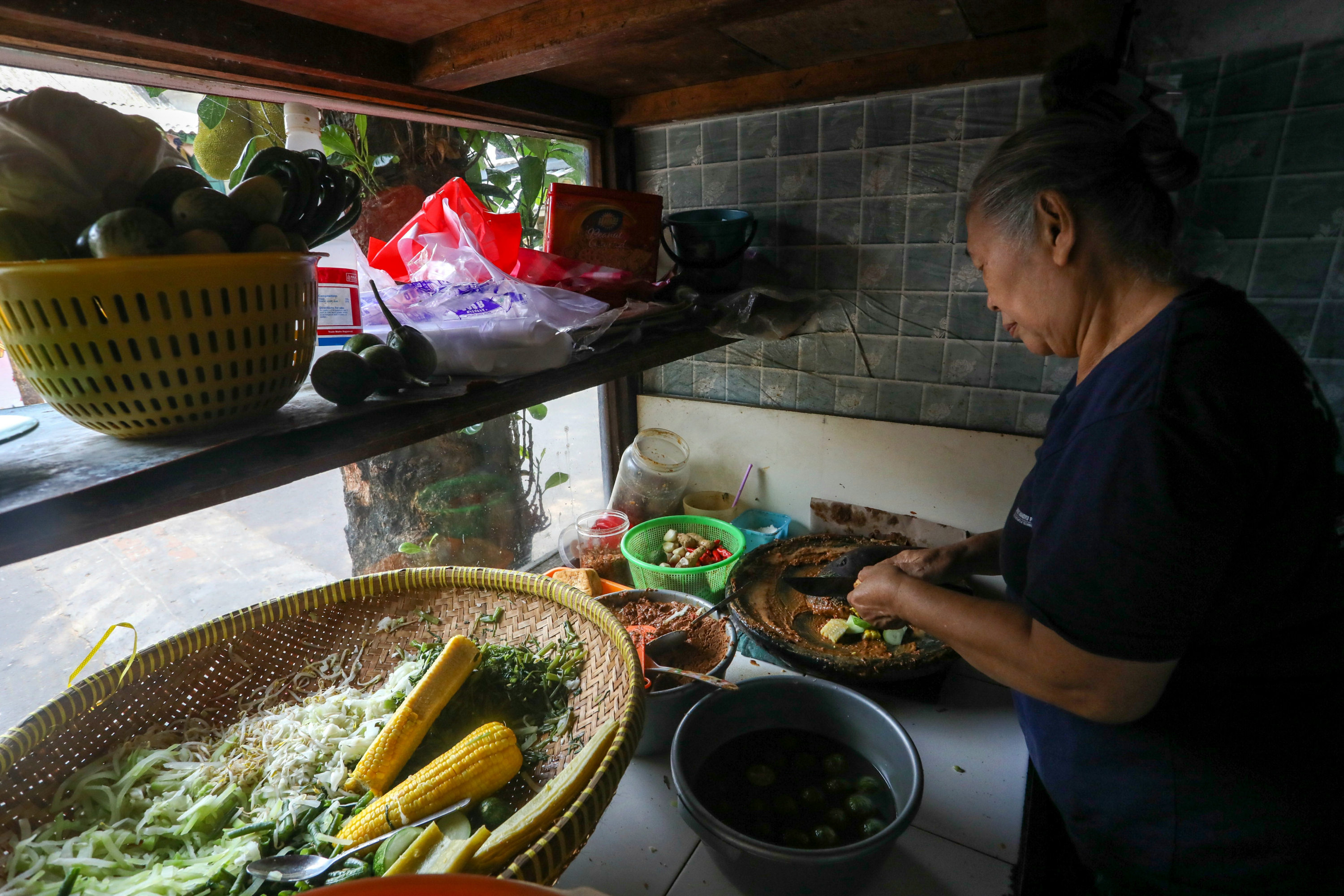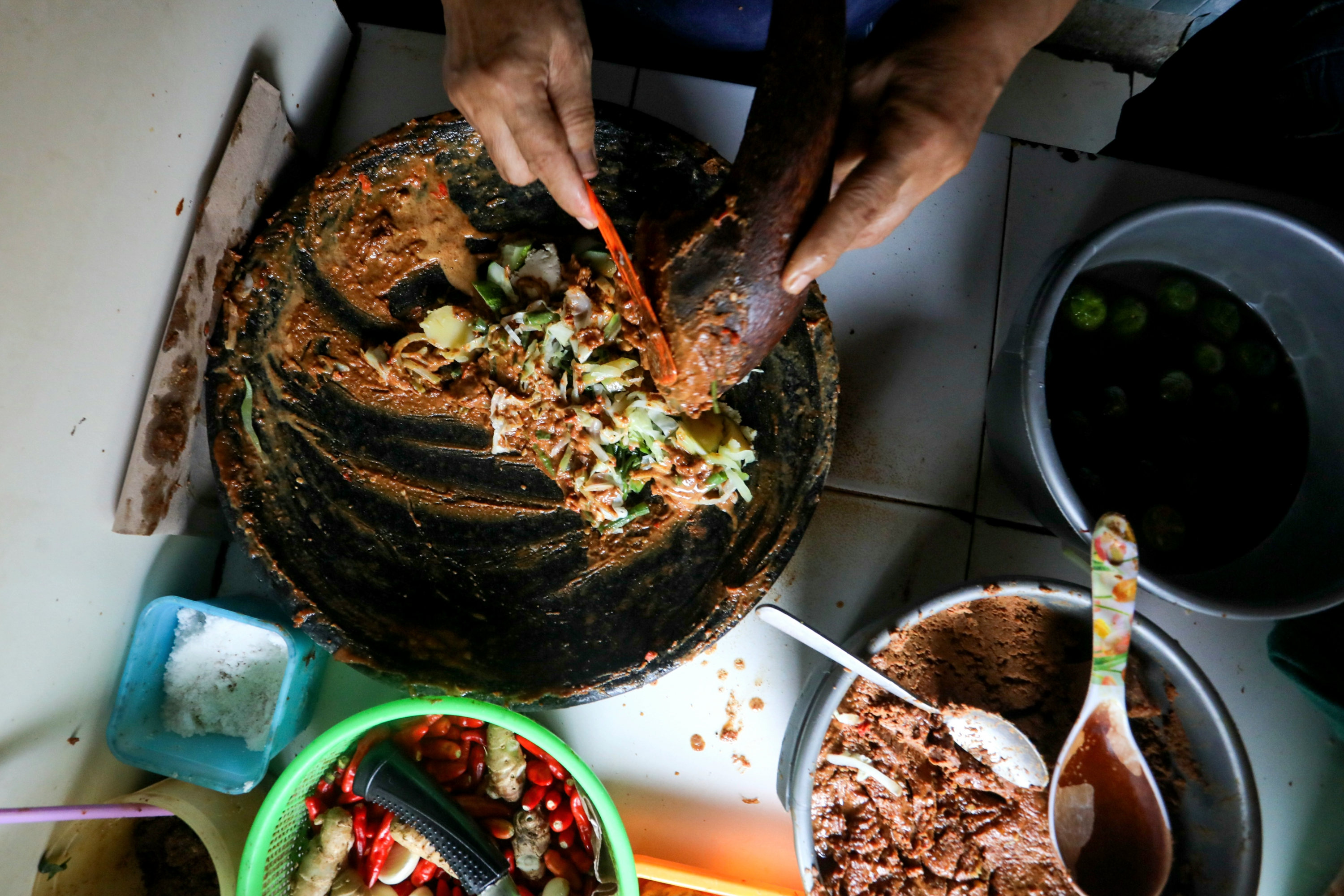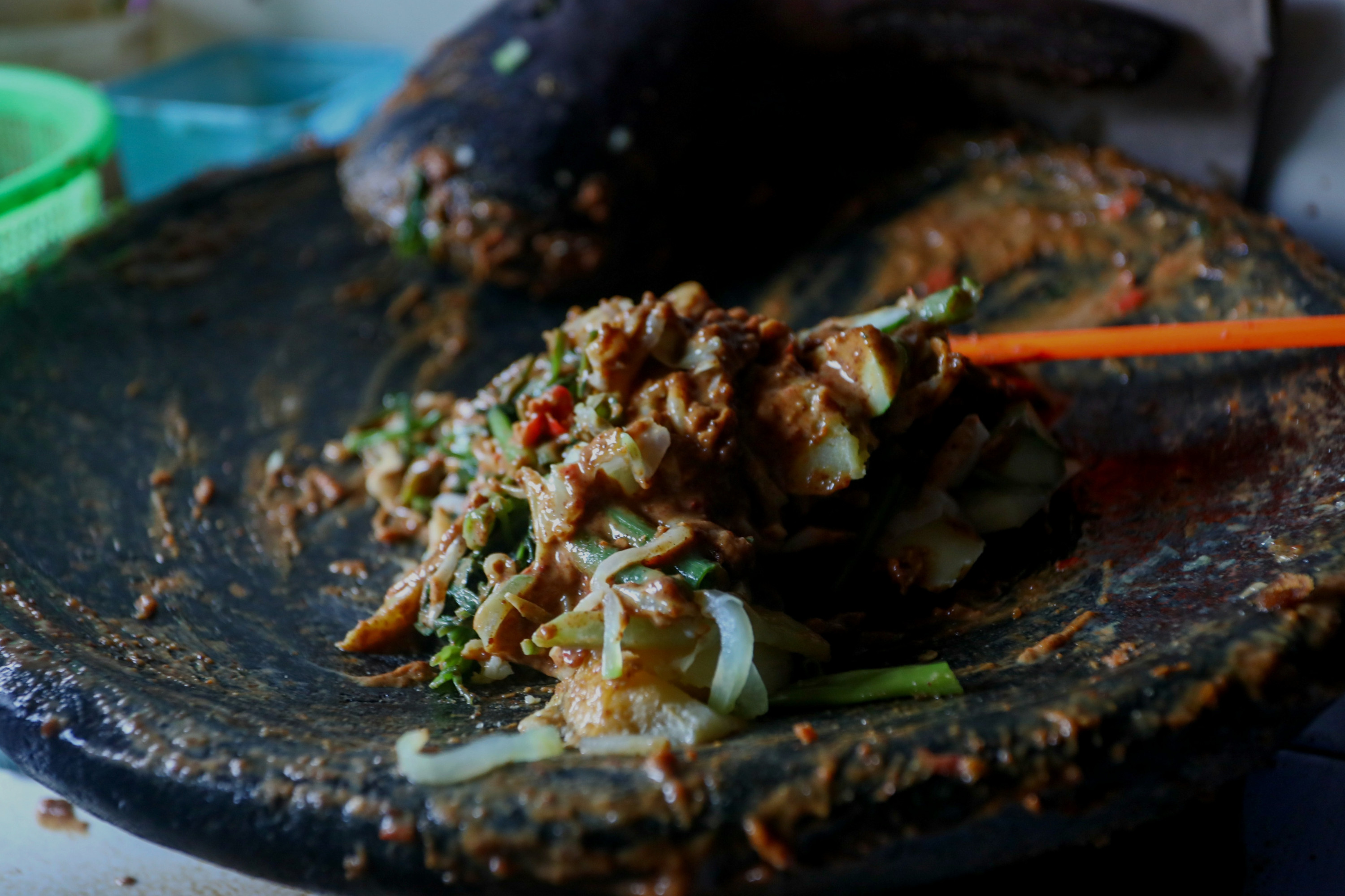 Untuk bumbu, ia memilih bahan-bahan terbaik seperti kacang tanah, cabai rawit, gula merah, terasi, garam, jeruk limo dan air asam Jawa.