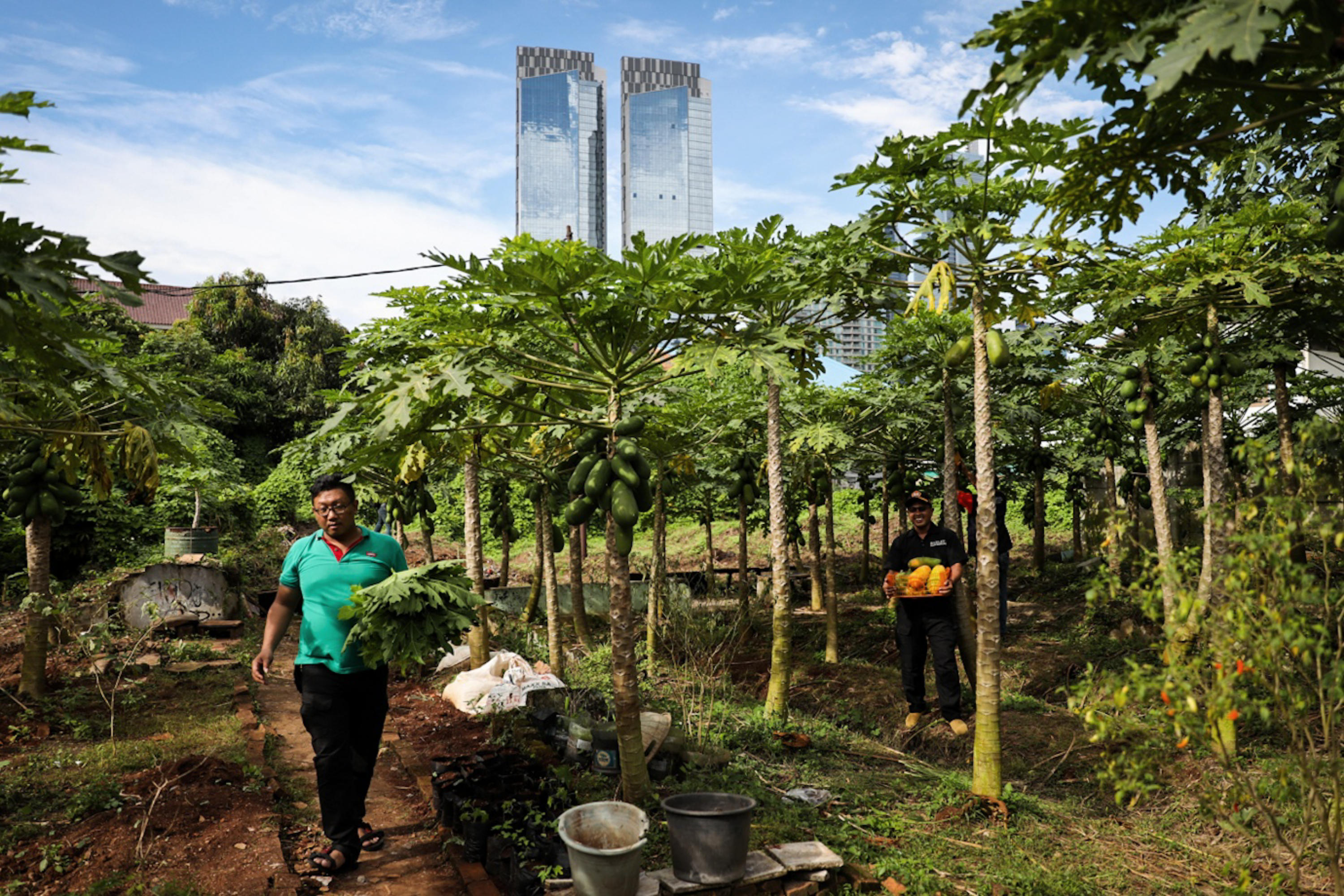 Sekelompok pria yang tergabung dalam Gabungan Kelompok Tani (Gapoktan) Taruna Jaya RW 06, Karet Tengsin, Jakarta Pusat ini asyik mengolah lahan seluas sekitar 600 meter yang terbentang di sela hutan beton antara Jalan KH Mas Mansyur dan Jalan Sudirman. Selain sayuran, mereka juga menggarap tanaman produktif seperti pisang dan pepaya california.